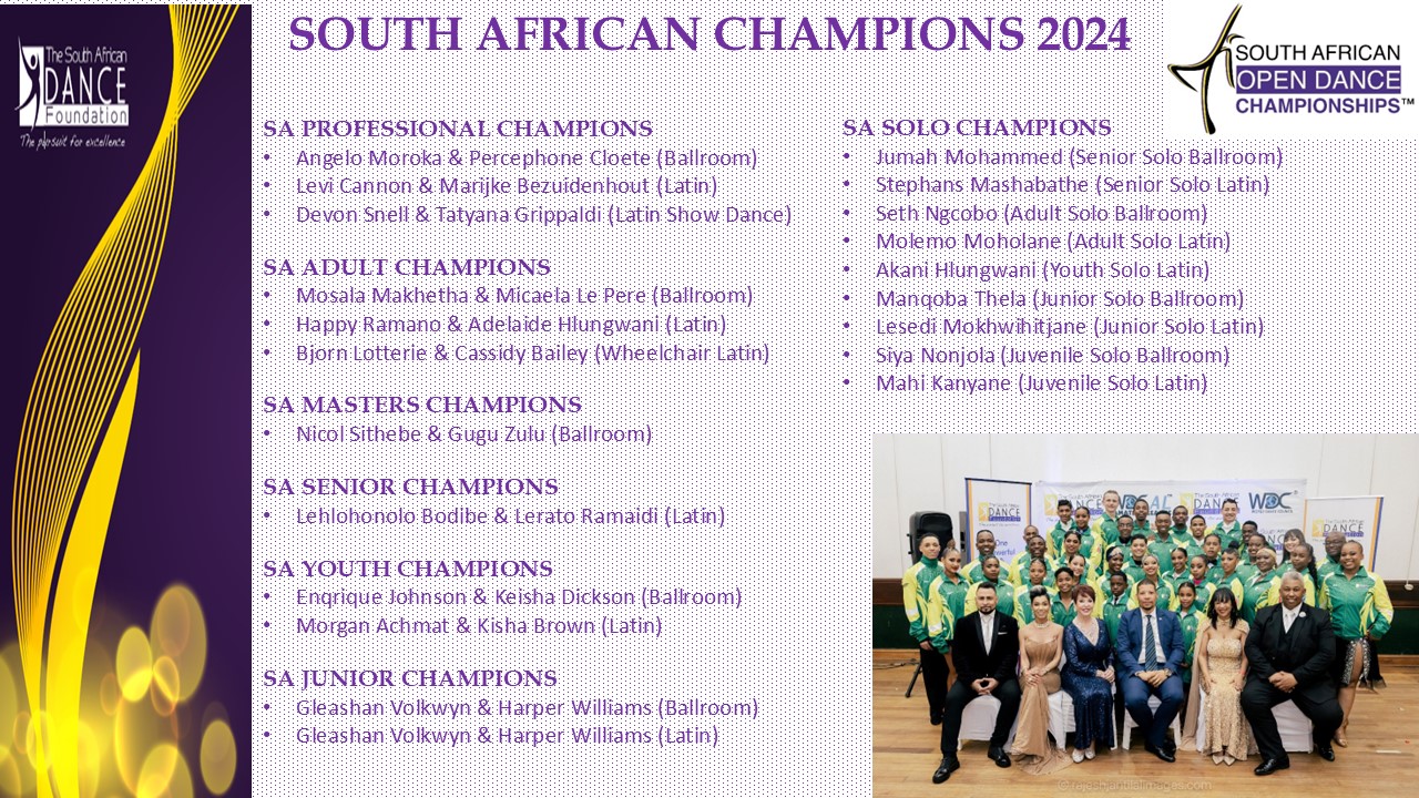 We are immensely pleased to have successfully hosted an all inclusive Open to the World Rumba in the Jungle⢠featuring the South African Championships⢠(SAODCâ˘) and applaud the SA Champions. Additionally, we successfully hosted 4 Super Series, Cup Competitions, multiple Dance Festivals, Valentines Ball, Talent Shows and Congresses. We proudly acknowledge the 24 dancers who were awarded South African Colours and the dancers and Adjudicators that flew the SA Flag internationally. A Big shoutout and heartfelt thanks to our amazing Sponsors for 2023, your support is the real dance floor that makes our events come alive!