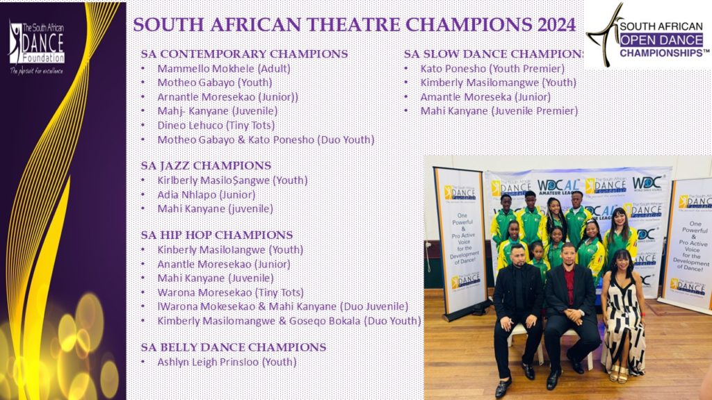 Kindly renew your SADF Membership to share in these benefits. We encourage you to route queries with respect to WDC or WDC AL sanctioned events to my Office to ensure that the communication is effectively dealt with. We extend warm appreciation for your amazing support at the 2019 South African Open Dance Championships, which was hosted at the magical Sibaya Casino and Entertainment Kingdom in Kwazula Natal. We extend congratulations to all the dancers on their accomplishments at the SA Open Dance Championships. We look forward to growing our footprint in the KZN Region.  Kindly note the date and venue for the 2020 KZN Championship, in addition to the Social/Pro-Am events will be made available soonest. Â
