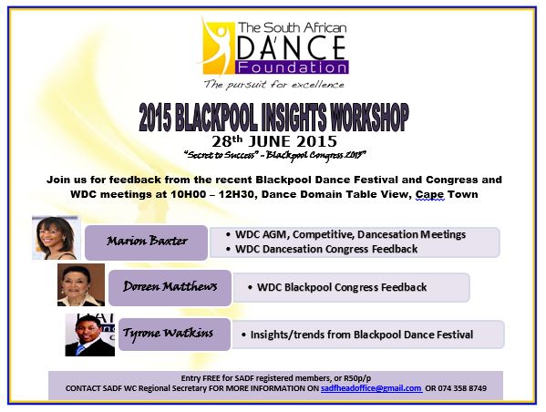 - Remembering the Blackpool Insights on Sunday, 28 June 2015, 10h00 at Dance Domain Table View. A great value add and FREE to ALL SADF registered members.